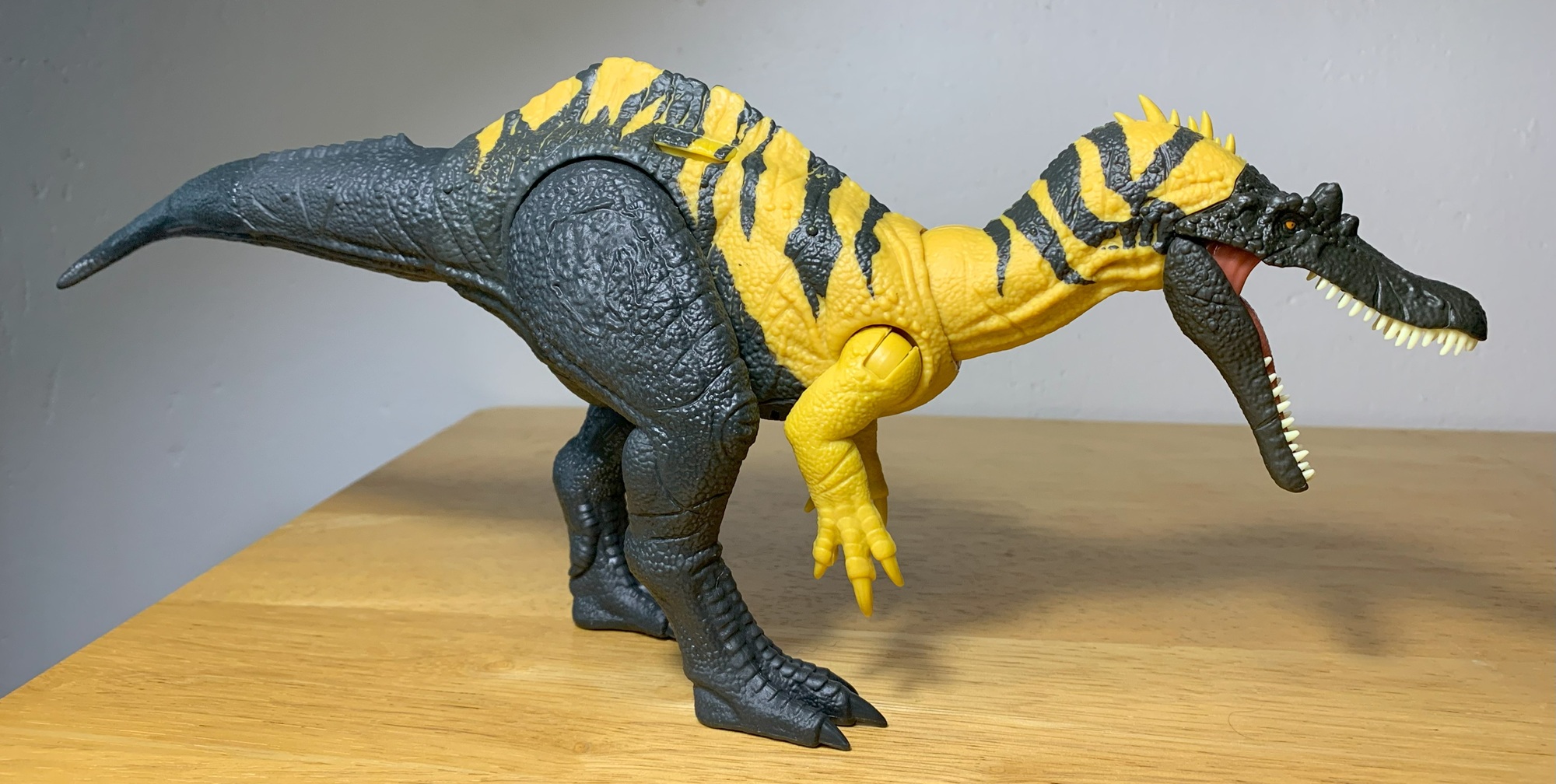 The toy represents a decently accurate spinosaur, which ads a lot of appeal, but the paintjob is appealing too, albeit incomplete looking. The head is entirely black with orange eyes, black pupils, and white teeth. The inside of the mouth is pink and glossy. The neck is yellow with black stripes, and this pattern continues along the flanks until it is entirely replaced with black coloration.