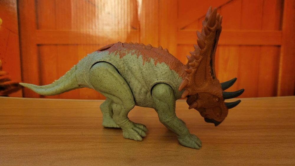 Over the many years since Mattel has had the Jurassic World license, the toy line has seen its fair share of ceratopsians (with a total of 18 genera at the moment), despite a handful featuring in the films (including the new Aquilops). Last year finally introduced one of my favorites, the Chasmosaurus. It’s not the first time Chamosaurus has popped up in a Jurassic toy line, as there was an electronic Chasmosaurus made by Kenner (owned by Hasbro at the time) for The Lost World: Jurassic Park Series 1 toyline in 1997 (which later received a repaint in the Jurassic Park Dinosaurs line). Nearly 30 years since the Kenner one released, we finally have another Chasmosaurus in a Jurassic toy line. As mentioned earlier it released last year, part of the Epic Evolution line up, and is part of the Strike Attack assortment which has simple action (or play) features, aside from the typical articulation.