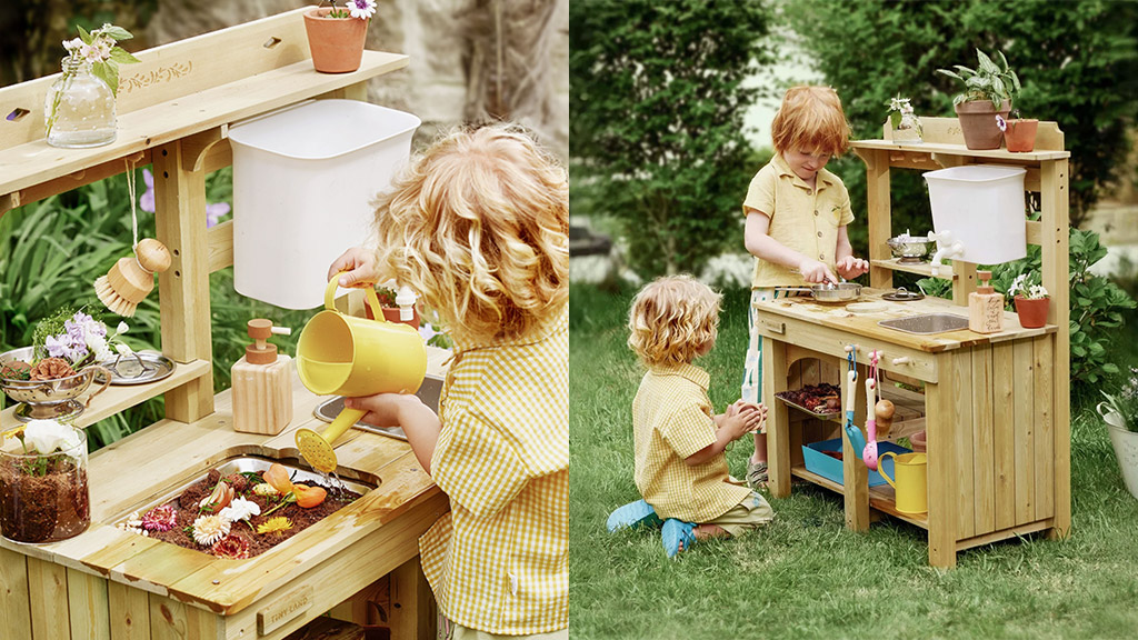 This outdoor play kitchen has everything kids need to create masterful mudpies, including a 2-liter water tank, functioning faucet, stainless steel cookware, and a mini watering can. A sensory bin hides beneath the stove for even more mixing, mashing, and splashing. Clean up is just as fun with its double-layer storage, complete with hooks to…