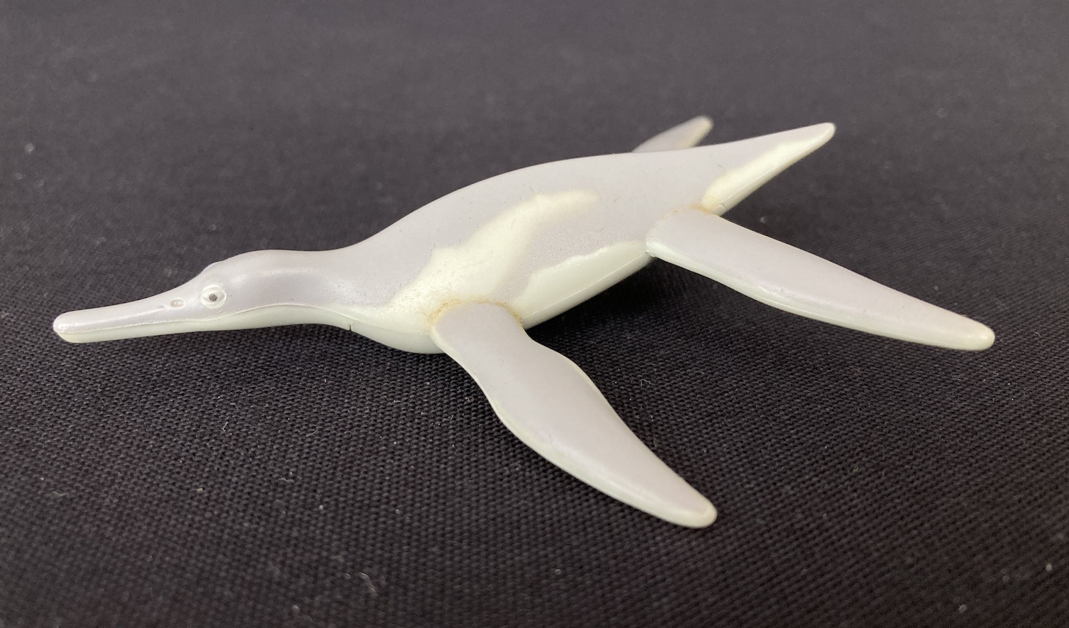 Anatomically the figure is excellent, particularly for such a small toy, and especially for a fast food giveaway. It’s immediately obvious this is a polycotylid plesiosaur, with its long narrow snout, torpedo-shaped body, short neck and tail, and graceful high aspect-ratio flippers. The eyes and nostrils are in the correct positions. Ten years after the release of Sea Monsters, a new polycotylid was described from Mexico with soft tissues preserved. This showed that the animal, Mauriciosaurus, had a chunky body with a beefy tail. This suggests that all polycotylids, and maybe even all plesiosaurs, were ‘fatter’ than previously supposed. So, if the Sea Monsters ‘Dolly’ were made today it might have been given a chunkier, less delicate design.