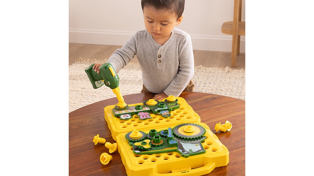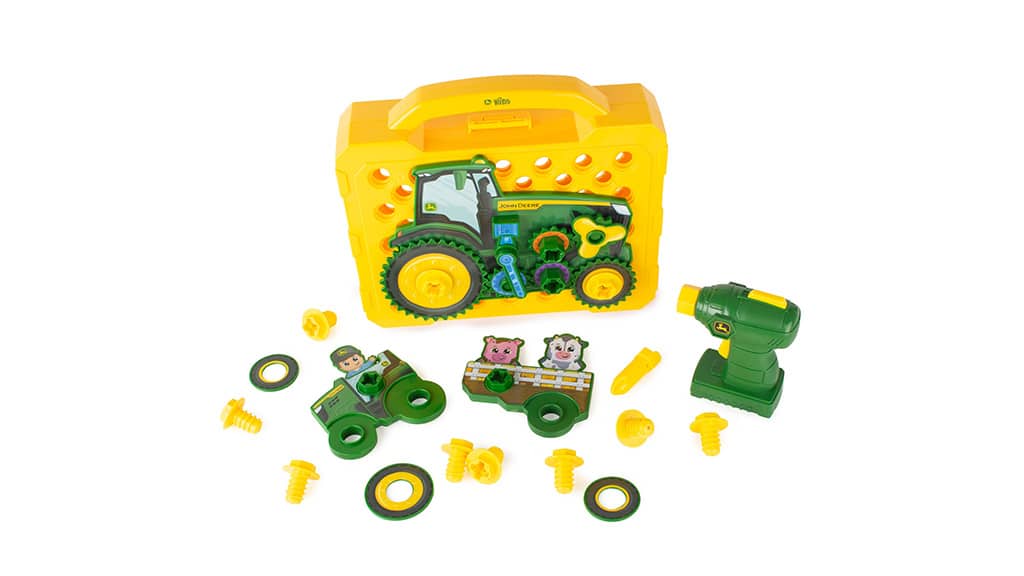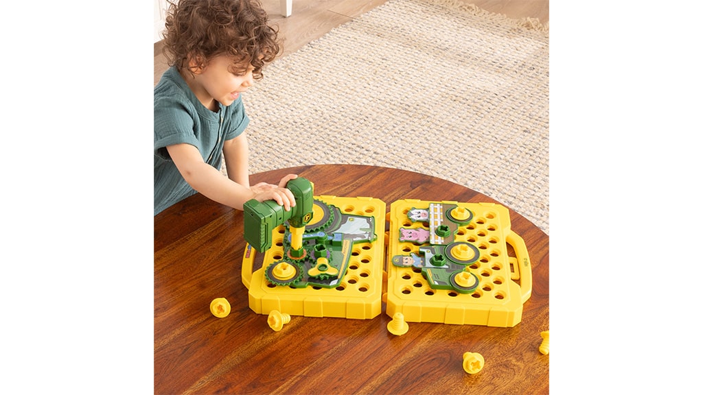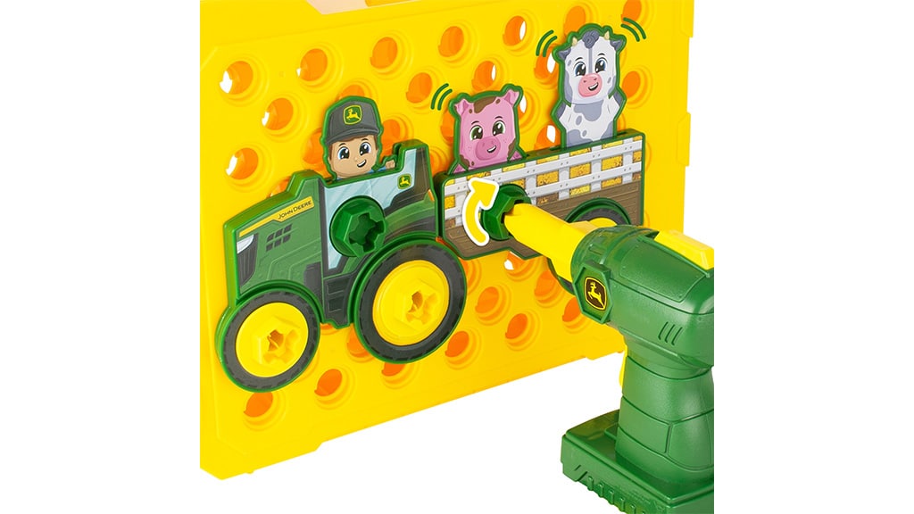 Kids can build two farm scenes using the included play drill, which fits inside the playboard for storage.