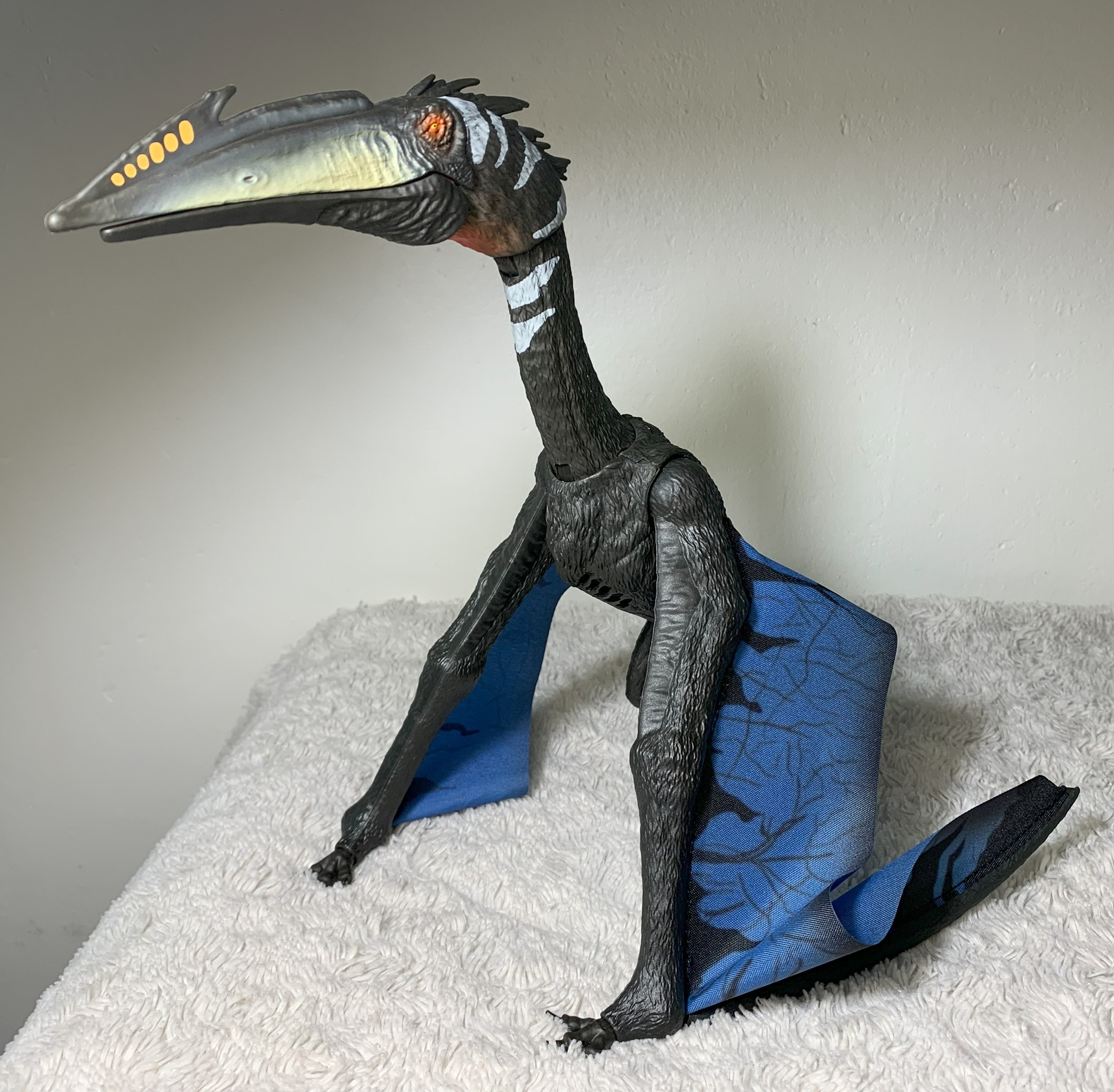 I do need to point out that the toy is not film accurate though. The Quetzalcoatlus in the movie has a shorter and wider bill that’s orange. It also has blue markings running down the neck and the wing membranes are blue on the outside surface and red on the inside. The toy more closely matches the render concept of the animal and since toys are often put into production before designs are finalized, inconsistencies in design are to be expected. Considering that the wings are fabric, I don’t think we should have expected them to display two different colors anyway.