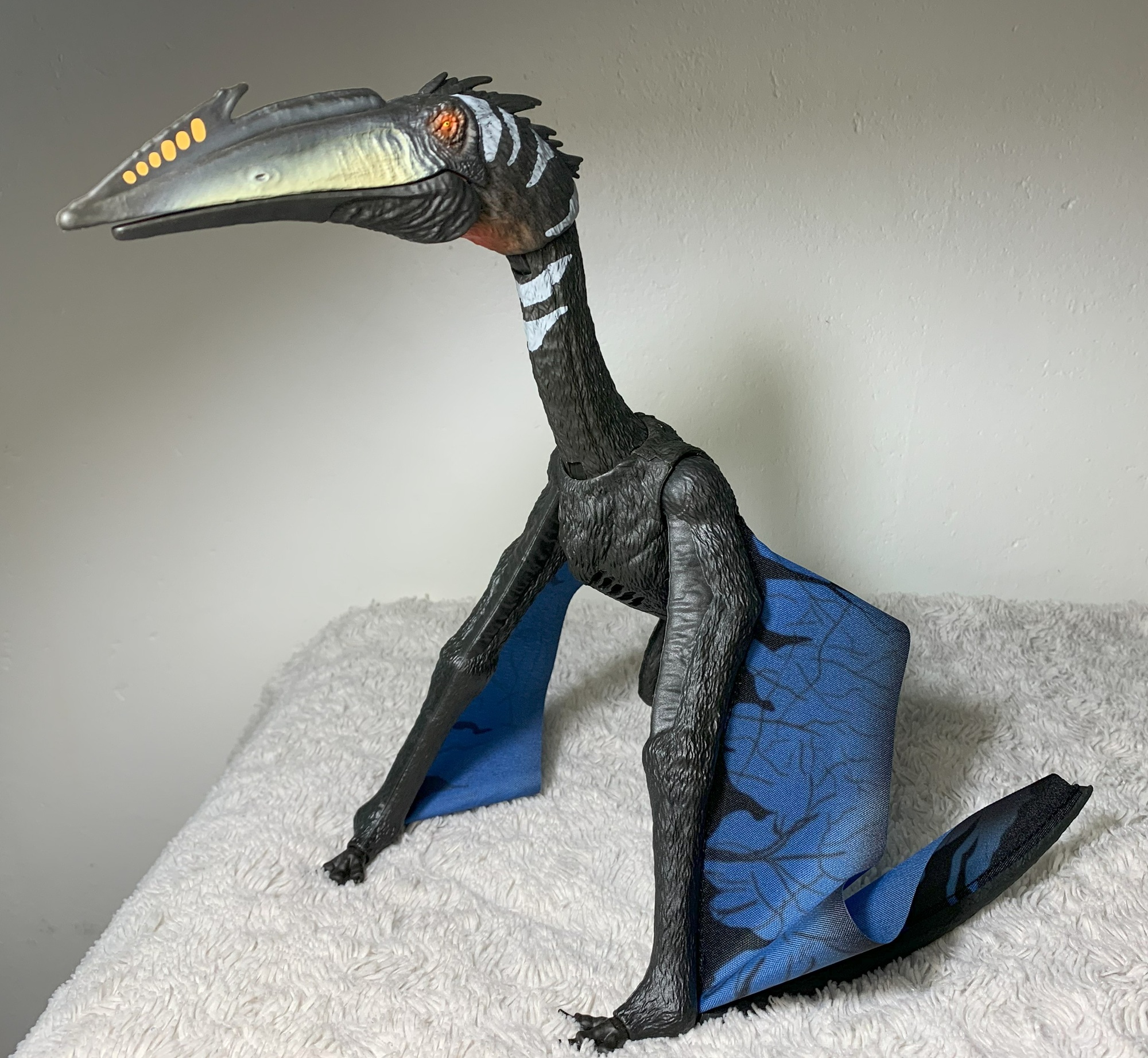 I do need to point out that the toy is not film accurate though. The Quetzalcoatlus in the movie had a shorter and wider bill that was orange. It also had blue markings running down the neck and the wing membranes are blue on the outside surface and red on the inside. The toy more closely matches the render concept for the animal and since toys are often put into production before designs are finalized, inconsistencies in design are to be expected. Considering that the wings are fabric, I don’t think we should have expected them to display two different colors anyway.