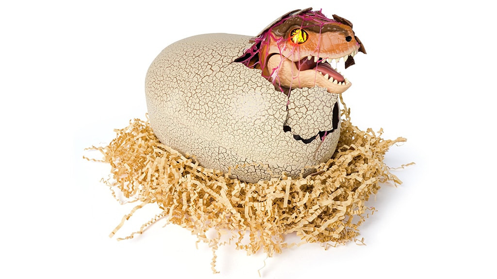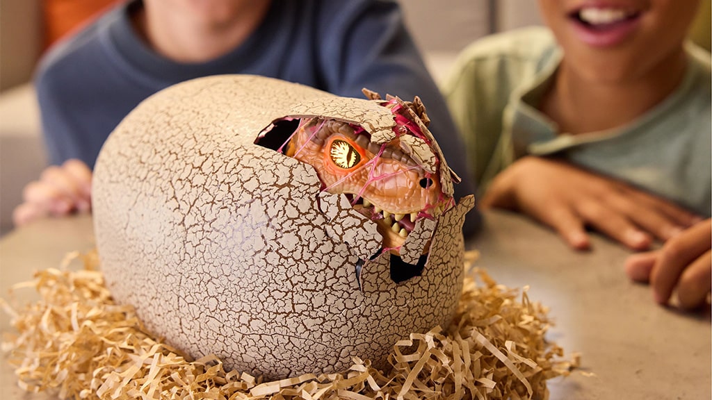 Families can add egg-citing fun to playrooms with the latest T. rex toy inspired by the Jurassic World franchise. The hatching process begins when kids ages 5 and up tap on the egg. Kids can watch the shell crack open and see a baby T. rex emerge from its gooey membrane.